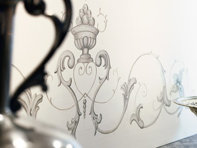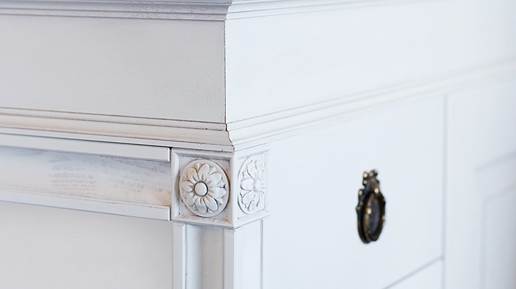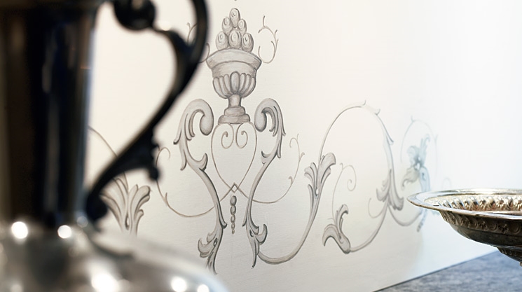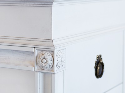 Köket Gustav tillverkas i massiv björk och träets ljusa, täta yta kommer bäst till sin rätt som målad med en patinaeffekt. Strukturen i färgen påminner om äggoljetempera och finns i tre kulörer.
