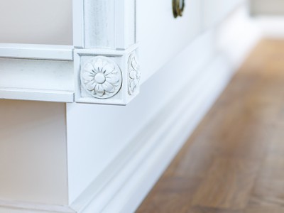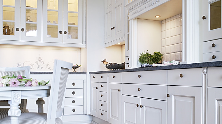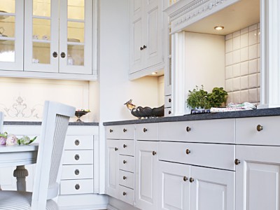 Köksstilen är skapad med inspiration hämtad från 1700-talet så här hittar du ljuvlig snickarglädje med många vackra detaljer.
