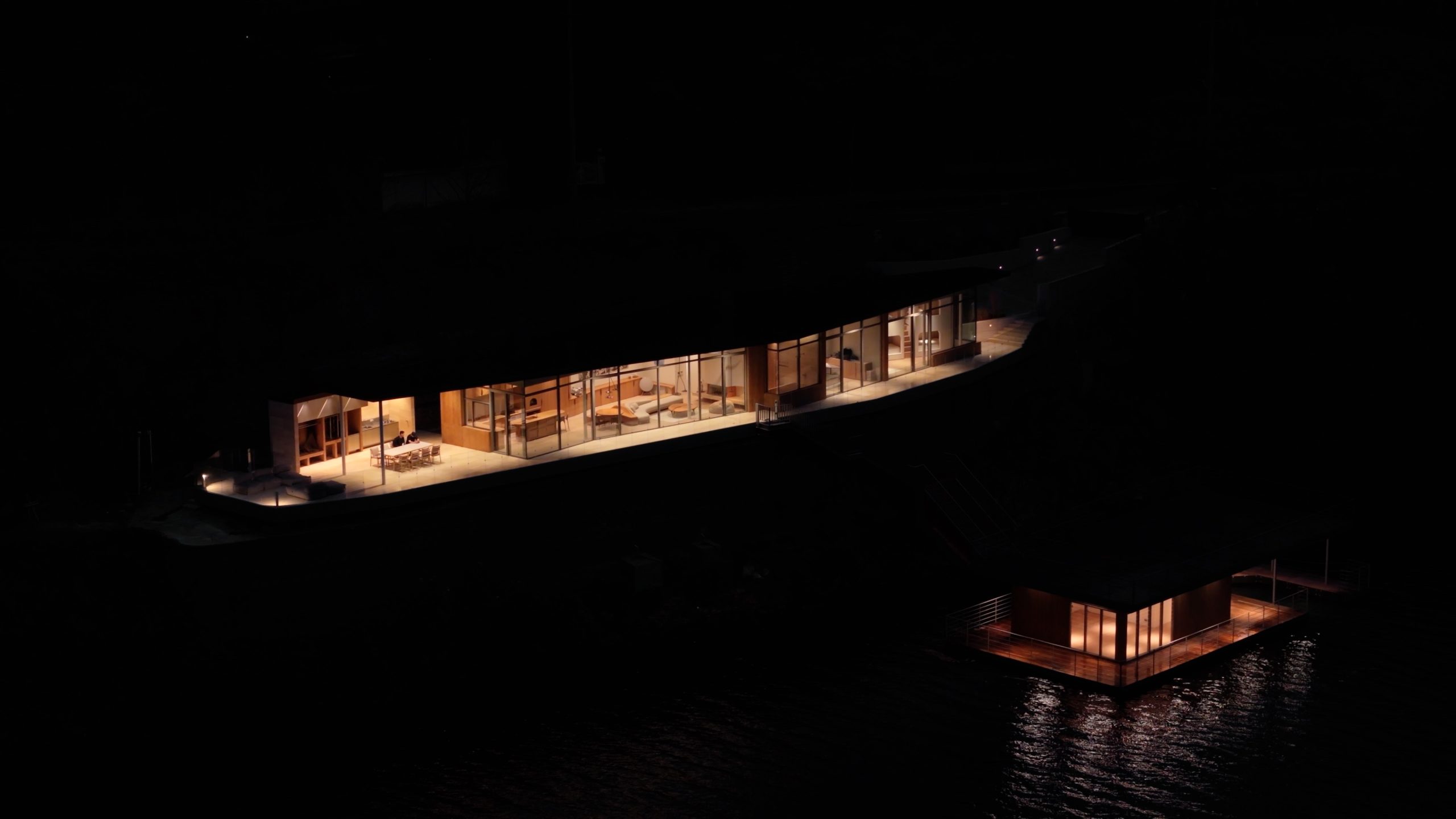 The house stretches quietly along the riverbank, its elongated roofline following the water’s curve. Floor-to-ceiling glass opens up the rooms to the surrounding mountains and river, allowing the interior to exist in dialogue with the landscape. Rather than imposing structure, the architecture listens – to the water, to the wind, to the rhythm of its setting.